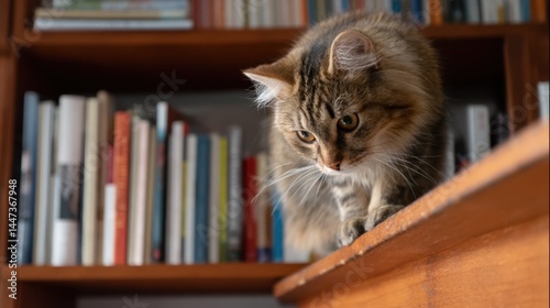 Curious Cat Exploring a Bookshelf
