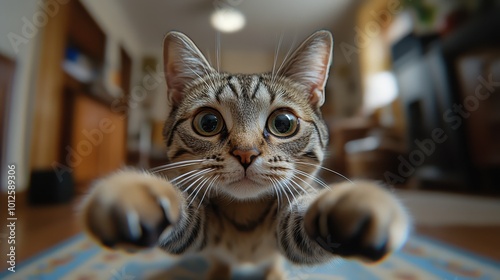 Curious cat reaching out to camera in a cozy home. Generative AI image