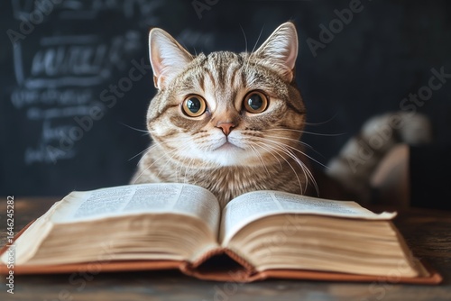 Curious Cat Studies an Open Book in a Cozy Study Surrounded by Bookshelves at Golden Hour.