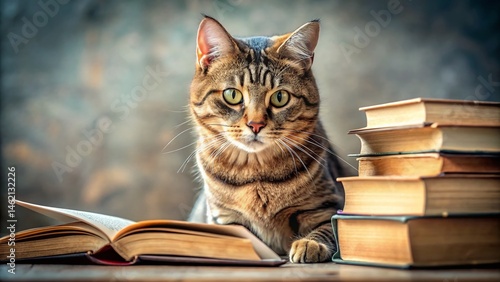 Curious Kitten Studying Books, High Depth of Field Stock Photo