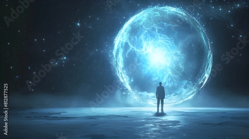 Curious Learner Approaches Glowing Future Sphere in Professional Attire