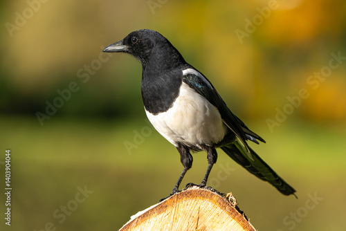 Curious magpie sits on a birch block