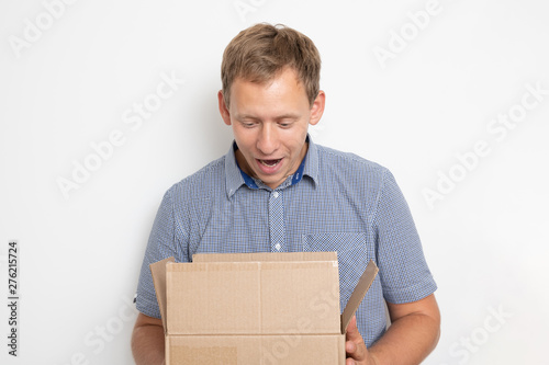 curious man looking inside a cardboard box he holds in his hands on a white background