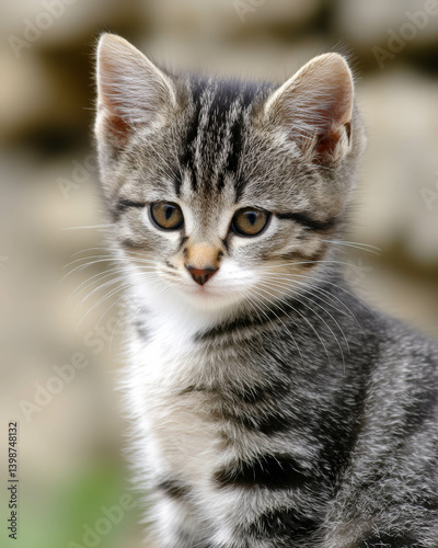 Curious ticked tabby kitten exploring a sunlit garden in the early morning