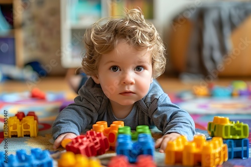 Curious Toddler Playing with Colorful Building Blocks
