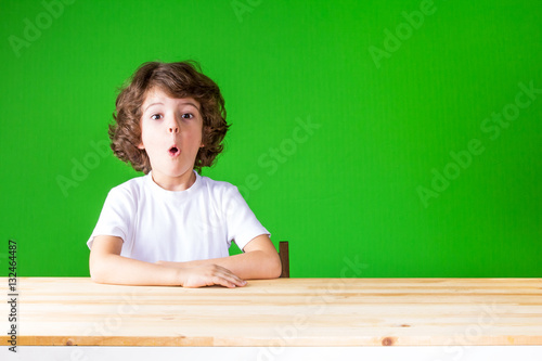 Curly cute boy with his mouth open looking at the camera. Close-up. Green background.