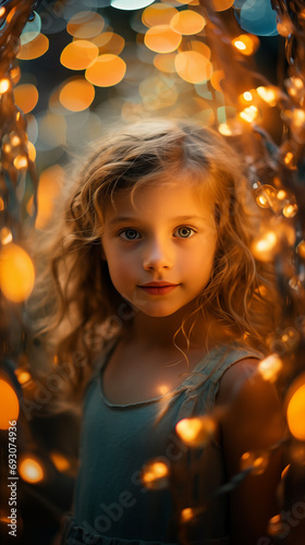 Curly-Haired Young Girl in Warm Glow & Cool Backdrop - Magical Bokeh Portrait of Innocent Beauty - Bokeh Lights Enhancing Magical Childlike Wonder
