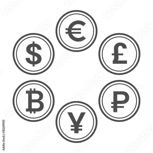 Currency flat icon set. Euro, dollar, bitcoin, yuan, ruble and pound sterling line style vector coins