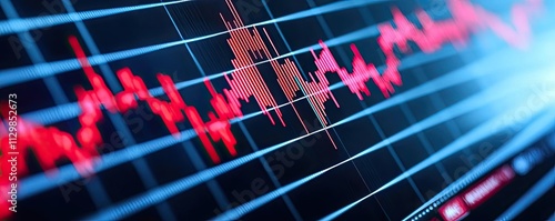 Currency value concept. Close-up of a stock market graph displaying fluctuating red and blue trends.