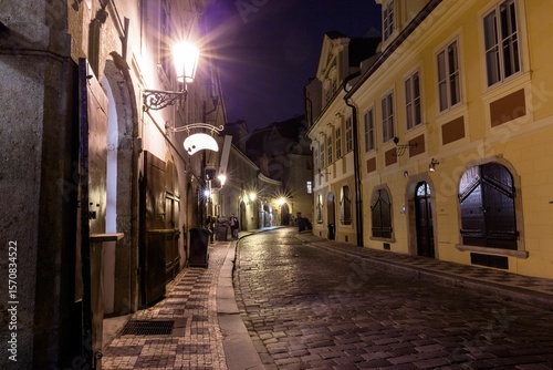 Curved cobblestone street is glowing under ornate lamps in flat design, showing hanging shop sign
