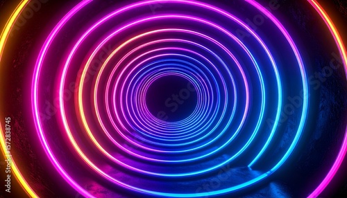 Curved neon tubes arranged in a concentric swirl against a textured backdrop, softly diffusing light in all directions.