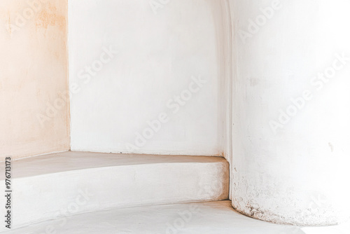 Curved white walls and an elegant column create a serene corner in a minimalist space during daylight hours