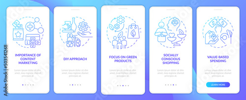 Customer behavior tendencies blue gradient onboarding mobile app screen. Walkthrough 5 steps graphic instructions pages with linear concepts. UI, UX, GUI template. Myriad Pro-Bold, Regular fonts used
