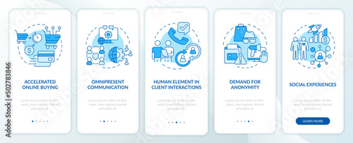 Customer behavior trends blue onboarding mobile app screen. Walkthrough 5 steps graphic instructions pages with linear concepts. UI, UX, GUI template. Myriad Pro-Bold, Regular fonts used