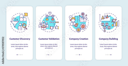 Customer development framework onboarding mobile app page screen with concepts. Communication strategies walkthrough 4 steps graphic instructions. UI vector template with RGB color illustrations