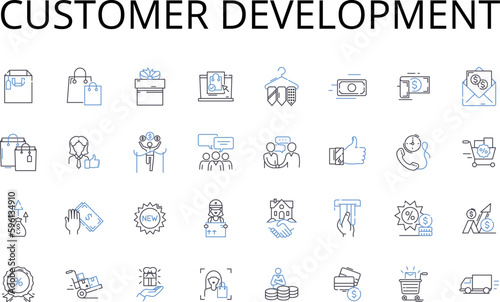 Customer Development line icons collection. Sales Growth, Team Building, Product Innovation, Branding Strategy, Marketing Research, Market Segmentation, Customer Retention vector and linear
