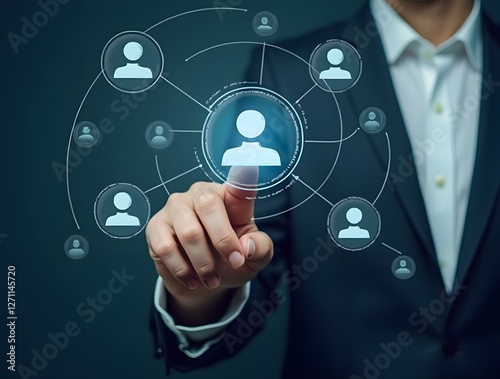 Customer relationship management CRM concept. Customer data and marketing database system. Businessman touching customer icon