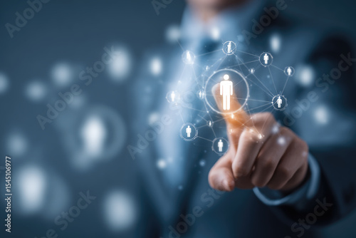 Customer relationship management or CRM concept. Businessman showing Customer relationship community online network technology. Global customer service system build brand loyalty. Digital business