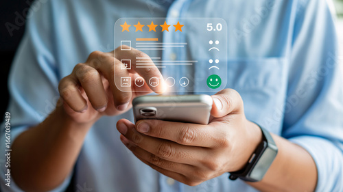 Customer Review on Smartphone with 5 Stars Positive Feedback for Mobile App or Online Store