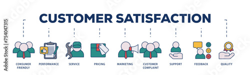 Customer satisfaction icons process structure web banner illustration of consumer friendly, performance, service, pricing, marketing, customer complaint icon live stroke and easy to edit