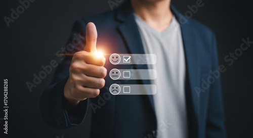 Customer satisfaction survey with positive feedback and thumbs up gesture