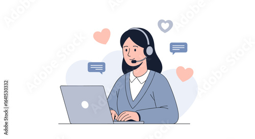 Customer service representative with headset working on laptop, online support concept, white background