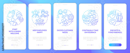 Customer service tips for hospitality industry gradient onboarding mobile app screen. Walkthrough 5 steps graphic instruction with linear concepts. UI, UX template. Myriad Pro-Bold, Regular fonts used