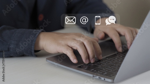 Customer support hotline Contact us people connection. Businessman using computer keyboard with the email, call phone, address, Chat message icons.