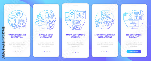 Customer-centric business blue gradient onboarding mobile app screen. Walkthrough 5 steps graphic instructions pages with linear concepts. UI, UX, GUI template. Myriad Pro-Bold, Regular fonts used