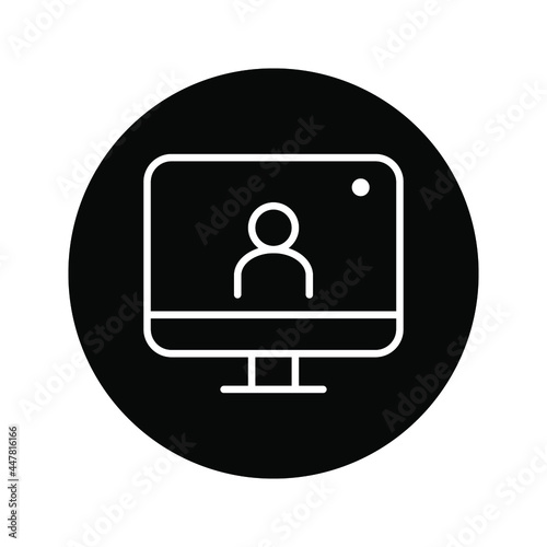 customisable real line icon of a desktop computer with a live broadcast on a social streaming channel with a symbol of a person having a video call or online conference meeting color editable