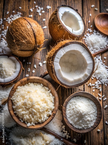 Cutaway coconuts and coconut flakes on a wooden table, top view