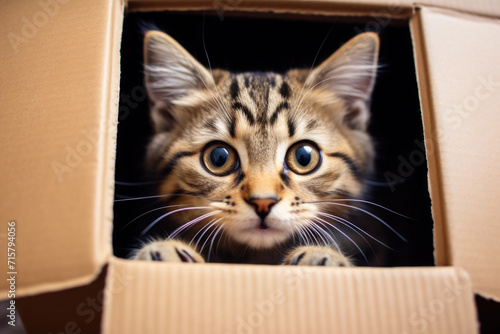 Cute and adorable tabby cat peeking out from a box