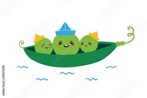 Cute and happy cartoon style green peas characters sailing on the boat. Vector illustration for kids, children.