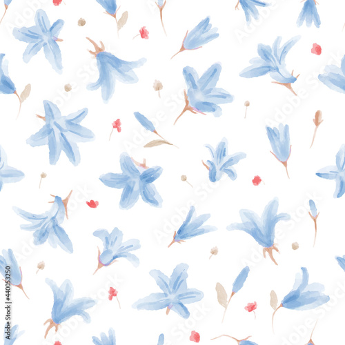 Cute and simple botanical seamless pattern, wild meadow flowers bells. Watercolor hand painted floral background with leaves, flowers and herbs