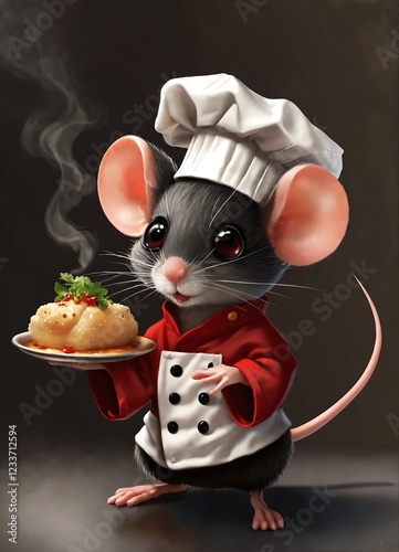 Cute and super adorable mouse in black and red chef coat and chef hat, holding a steaming entree.