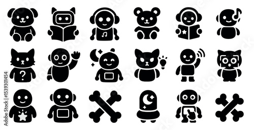 Cute animal and robot silhouette icons set – filled, solid characters and symbols