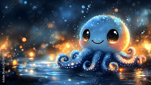 Cute, animated blue octopus with large eyes smiling on a dark glittering surface; bokeh lights behind it