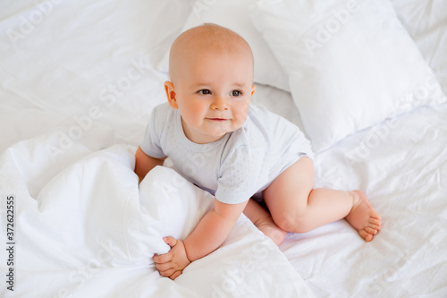Cute baby boy 6 months smiling in a white bodysuit sitting on a bed on white bedding