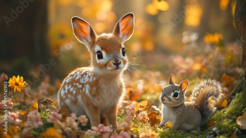 Cute baby deer and squirrel in a colorful autumn forest