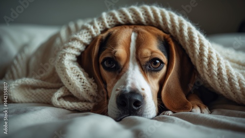 Cute Beagle lying on bed beneath warm knitted blankets and sweaters during cold weather