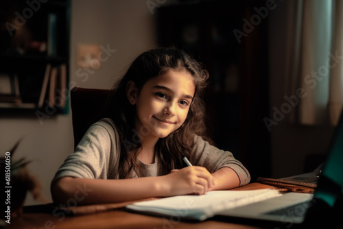 cute beautiful Indian female child studying on laptop pc at home. generative AI