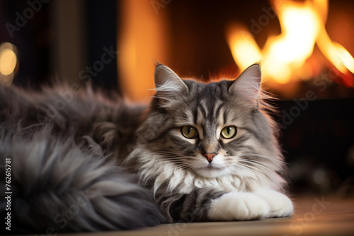 Cute black fluffy pet. He sleeps on the carpet in front of the fireplace сreated with Generative Ai