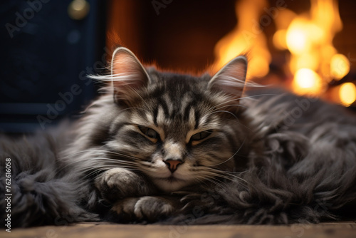 Cute black fluffy pet. He sleeps on the carpet in front of the fireplace сreated with Generative Ai