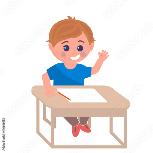 Cute boy character studying at the desk isolated vector illustration. Back to school concept.