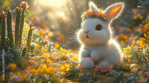 Cute bunny with flower crown holds Easter egg among colorful flowers