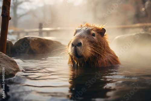Cute Capybara animal bathing in hot spring