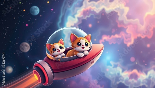 Cute cartoon cats in spaceship exploring vibrant nebula, graphic, cute
