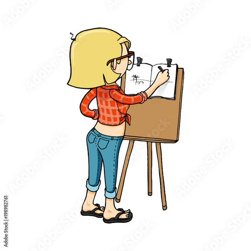 Cute cartoon girl sketching with easel and sketchbook. Vector isolated hand drawn character.