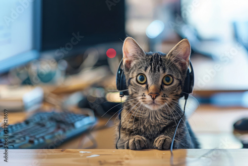Cute cat in an office setting answering calls in a busy call center. Generative AI