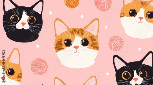 Cute Cat Pattern on Pink Background with Colorful Yarn Balls